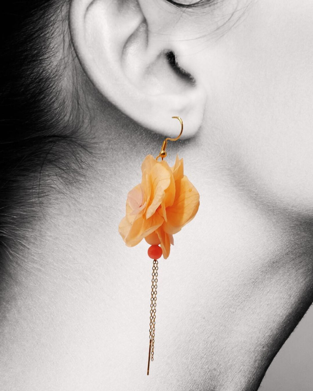 Description : Des boucles artisanales qui marient l’acier doré à la finesse d’une fleur stabilisée. Un accessoire romantique et unique, idéal pour un look bohème chic.