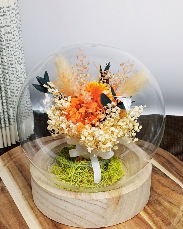 Sous cette cloche ronde en verre, un mini bouquet vibrant déploie toute sa force : une rose éternelle rouge-orange accompagnée de fleurs séchées et de détails subtils sur socle en bois naturel. Une touche chaleureuse et audacieuse qui illumine votre intérieur.