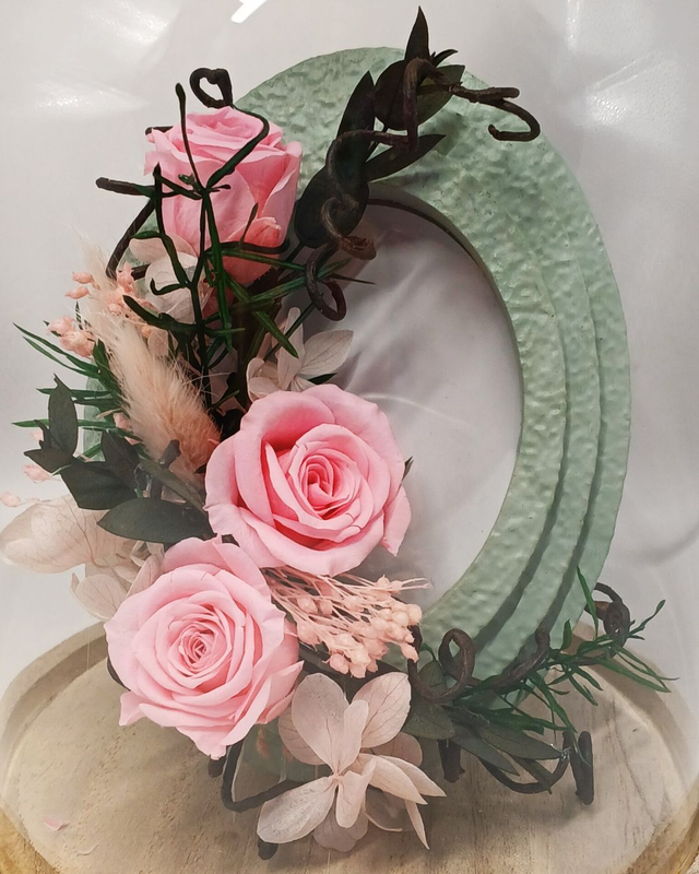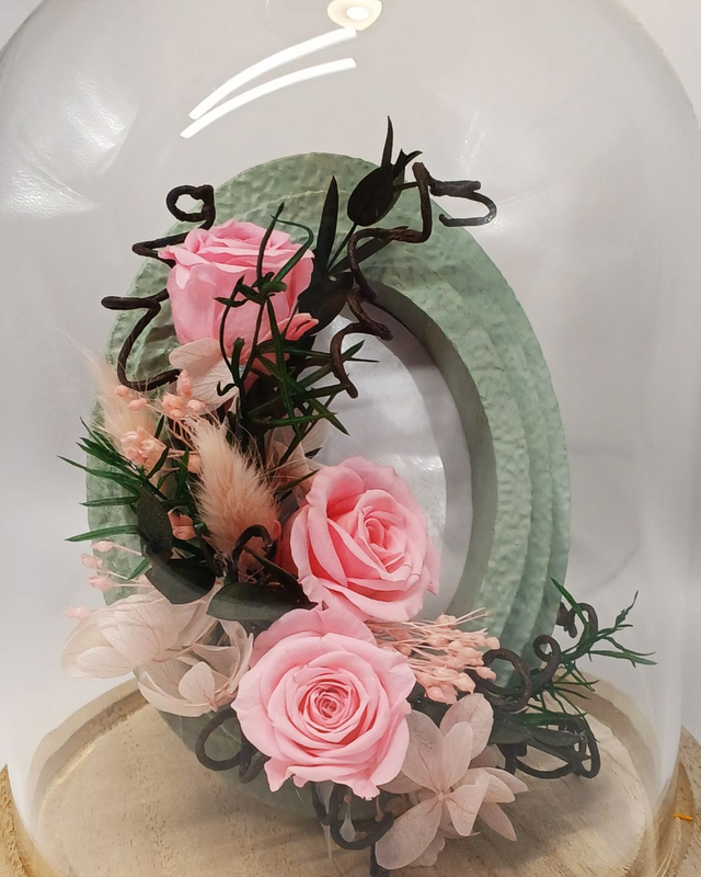 Matières :Cloche en verre transparent, Socle en bois naturel, MINI CADRE PHOTO NON UTILISABLE Fleurs éternelles : 3 ROSES PÂLES + fleurs OU feuillages d’accompagnement