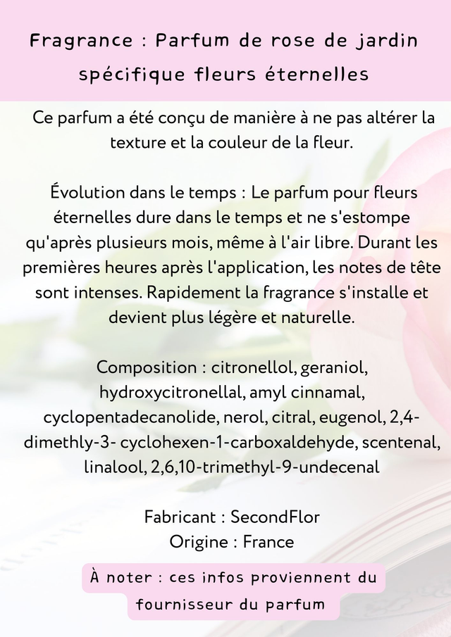 Ajoutez un parfum à votre création pour la rendre encore plus unique. Une touche olfactive qui séduit et marque les esprits. (Parfum de rose de jardin)