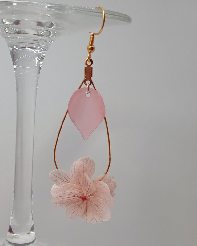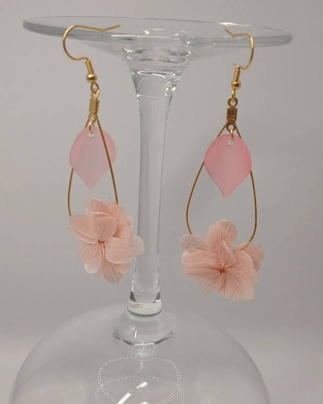 Matériaux : Acier inoxydable hypoallergénique couleur or / Fleur stabilisée Hortensia rose pâle.